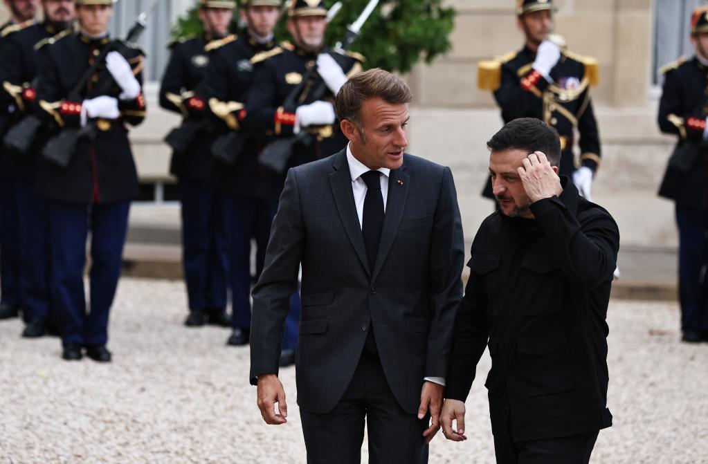 9月3日,在法国巴黎总统府爱丽舍宫,法国总统马克龙(左)迎接来访的乌克兰总统泽连斯基。新华社记者 高静 摄